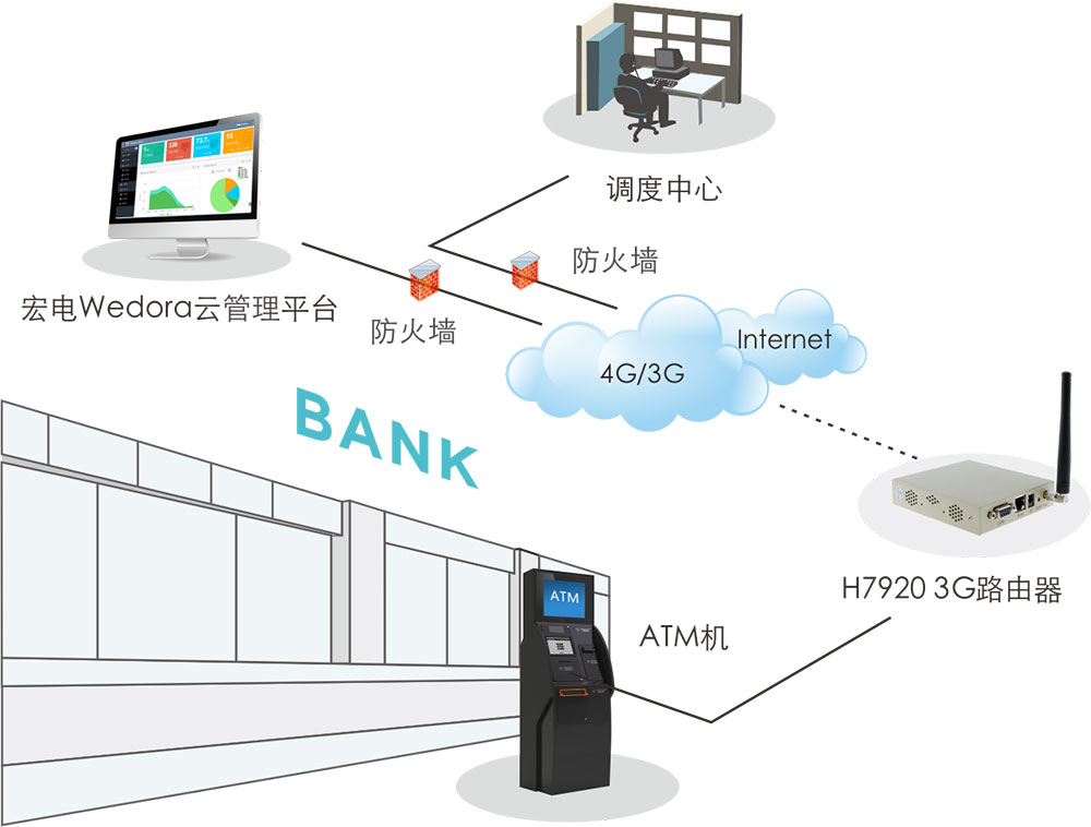 廣發(fā)銀行是國內(nèi)最早組建的股份制商業(yè)銀行之一。目前,隨著廣發(fā)銀行業(yè)務(wù)的拓展,自助交易的便捷性和靈活性讓自助交易金額屢創(chuàng)新高,進(jìn)一步加大了自助ATM終端應(yīng)用的需求。傳統(tǒng)專線方式接入的成本較高,離行設(shè)備施工不便,而3G無線傳輸可以擺脫線纜的束縛,并具有設(shè)備成本低、數(shù)據(jù)傳輸安全可靠、使用靈活方便等特點,受到了廣發(fā)銀行的青睞。經(jīng)過多方調(diào)研,廣發(fā)銀行最終選擇深圳市宏電技術(shù)股份有限公司作為其組網(wǎng)方案及無線路由器設(shè)備供應(yīng)商,雙方達(dá)成了良好的戰(zhàn)略合作協(xié)議。