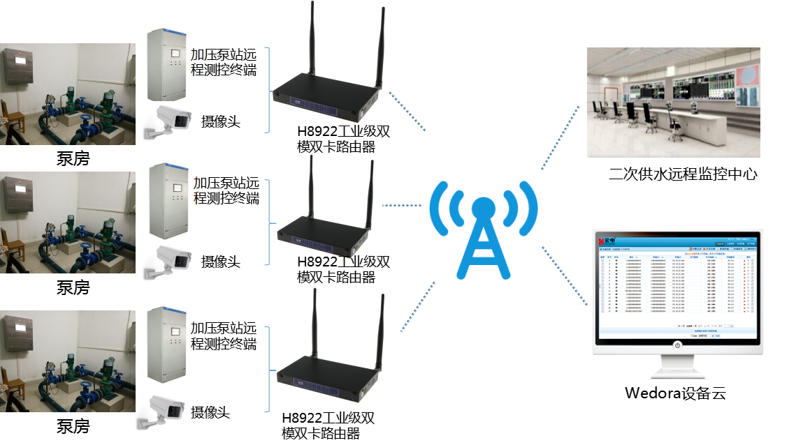宏電作為M2M行業(yè)先行者,一直積極探索產(chǎn)業(yè)+物聯(lián)網(wǎng)的深度融合,在推動(dòng)城市信息化、數(shù)字化升級(jí)的過程中積累豐富的實(shí)踐經(jīng)驗(yàn),本項(xiàng)目提出建設(shè)一套集監(jiān)控、管理、分析與一體的數(shù)據(jù)采集與傳輸遠(yuǎn)控系統(tǒng),對(duì)此提供基于4G無(wú)線通信的二次供水遠(yuǎn)程監(jiān)控系統(tǒng),該系統(tǒng)前端將泵站測(cè)控終端、攝像頭連接宏電H8922工業(yè)級(jí)雙模雙卡路由器,后端接入二次供水遠(yuǎn)程監(jiān)控平臺(tái)、宏電Wedora設(shè)備云。