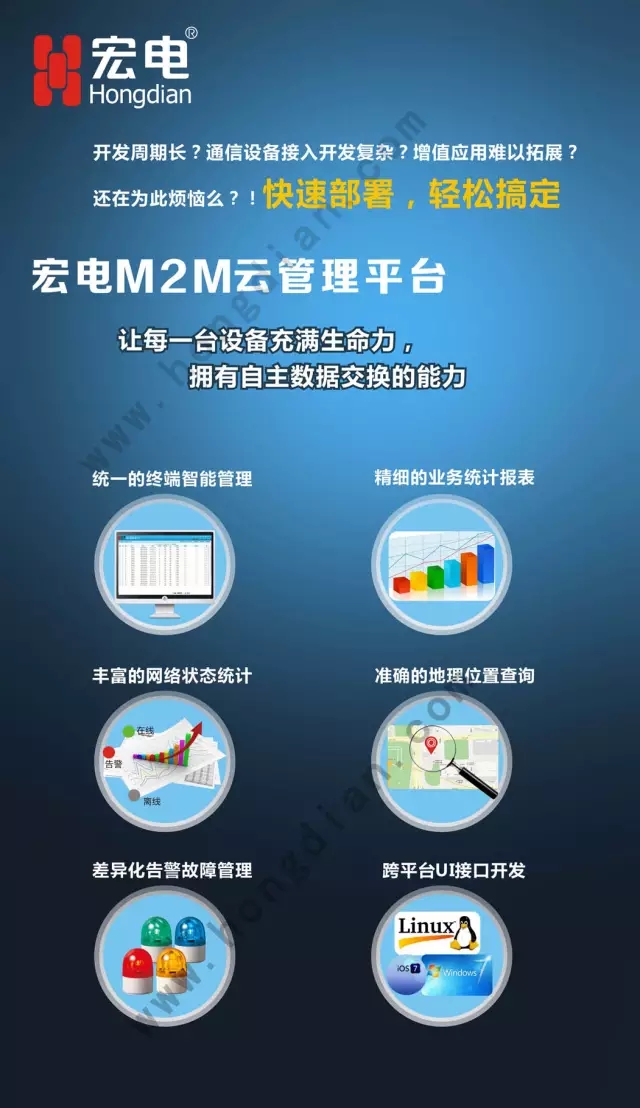 對(duì)于不具備開發(fā)實(shí)力或者開發(fā)成本較高的企業(yè),宏電還可以提供快速部署的M2M云管理平臺(tái),實(shí)現(xiàn)設(shè)備的統(tǒng)一管理、精細(xì)統(tǒng)計(jì)、狀態(tài)統(tǒng)計(jì)、故障管理以及跨平臺(tái)開發(fā),讓每一臺(tái)設(shè)備都充滿生命力,擁有自主數(shù)據(jù)交換的能力。