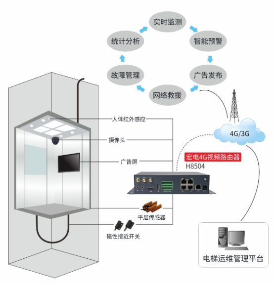 現(xiàn)場(chǎng)演示的電梯物聯(lián)網(wǎng)系統(tǒng)吸引行業(yè)觀眾駐足交流,該系統(tǒng)由電梯相關(guān)傳感器、宏電H8504 VTU 4G視頻路由器、廣告媒體發(fā)布平臺(tái)、電梯運(yùn)維管理平臺(tái)組成,通過將電梯內(nèi)人體紅外感應(yīng)器、攝像頭、廣告屏、平層傳感器、磁性接近開關(guān)等接入到 4G視頻路由器,實(shí)現(xiàn)電梯運(yùn)行速度、電梯負(fù)載、層數(shù)、開關(guān)門信息及時(shí)上傳到電梯運(yùn)維管理平臺(tái),維保部門、物業(yè)部門、質(zhì)監(jiān)部門能實(shí)時(shí)查看到電梯運(yùn)行情況,監(jiān)控視屏遠(yuǎn)程查看,一旦有危險(xiǎn)情況,能通過GIS地圖定位到故障電梯,及時(shí)處理險(xiǎn)情,同時(shí)對(duì)于廣告運(yùn)營(yíng)商而言,可以在廣告媒體發(fā)布平臺(tái)遠(yuǎn)程更換公告。