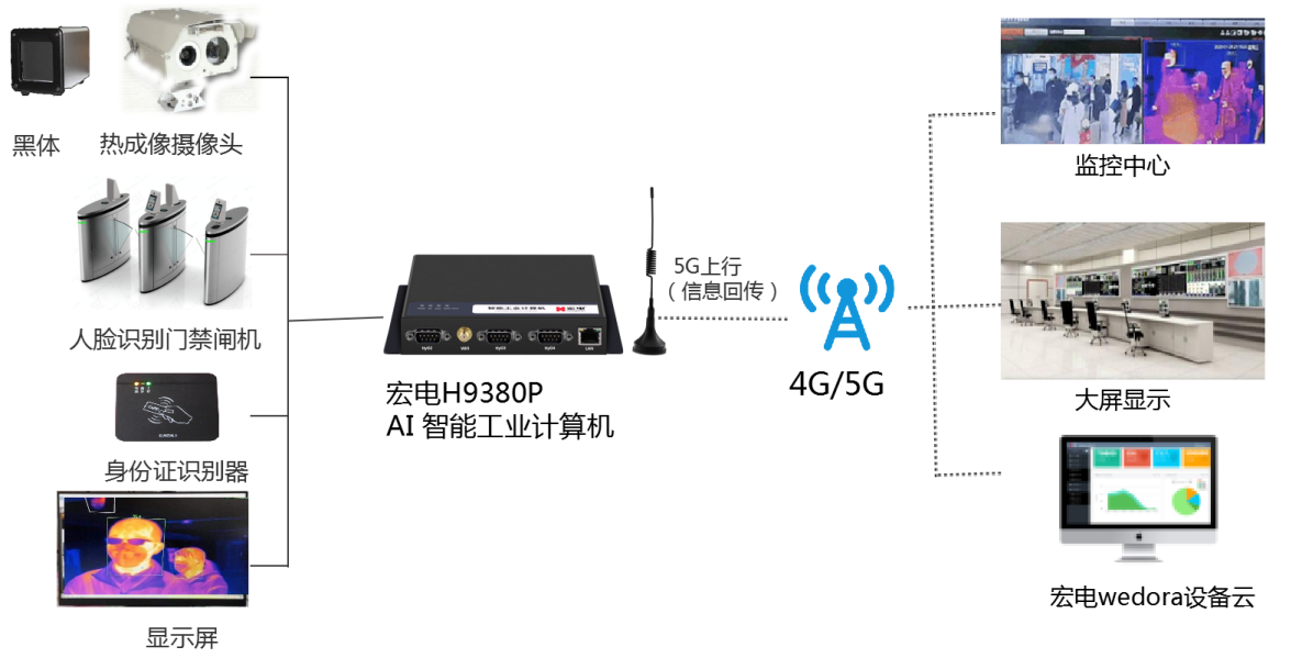 如何在提高人員通行效率的同時(shí)又保證檢測(cè)的準(zhǔn)確率,對(duì)此宏電提供基于AI智能工業(yè)計(jì)算機(jī)的物聯(lián)網(wǎng)智能體溫監(jiān)測(cè)方案,宏電H9380P AI智能工業(yè)計(jì)算機(jī)可接入熱成像攝像頭、顯示屏、身份證識(shí)別器、門禁等,并實(shí)時(shí)通過(guò)5G、4G網(wǎng)絡(luò)將體溫、身份證信息、圖像、視頻等數(shù)據(jù)上傳到云平臺(tái)和監(jiān)控中心,實(shí)現(xiàn)遠(yuǎn)程智能監(jiān)測(cè),可同時(shí)滿足體溫實(shí)時(shí)監(jiān)測(cè)、人證信息實(shí)時(shí)對(duì)比需求。