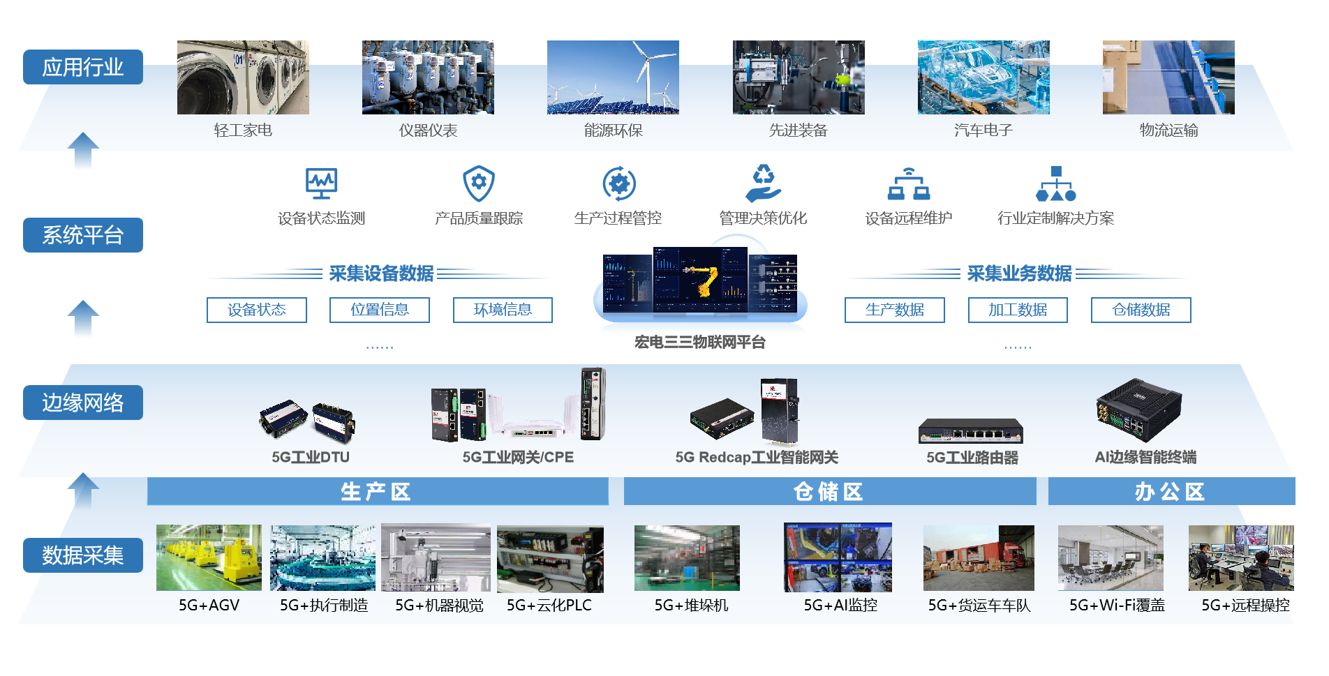 在工業(yè)互聯(lián)網(wǎng)方面,宏電股份重點(diǎn)解決OT和IT融合的問題,提供設(shè)備聯(lián)網(wǎng)、協(xié)議解析、數(shù)據(jù)采集、數(shù)據(jù)處理、平臺(tái)運(yùn)維、能耗管理等完整的工業(yè)互聯(lián)網(wǎng)解決方案。例如,在生產(chǎn)區(qū)可實(shí)現(xiàn)工業(yè)裝備遠(yuǎn)程運(yùn)維、PLC之間協(xié)同工作、機(jī)器視覺高清圖片視頻高速傳輸?shù)葢?yīng)用;在倉儲(chǔ)區(qū)則可以做到AGV互聯(lián)互通、移動(dòng)設(shè)備無線聯(lián)網(wǎng),確保終端在移動(dòng)過程中業(yè)務(wù)不中斷;在園區(qū)中通過WiFi Mesh同頻組網(wǎng),實(shí)現(xiàn)工廠5G網(wǎng)絡(luò)全覆蓋,數(shù)據(jù)不出廠。