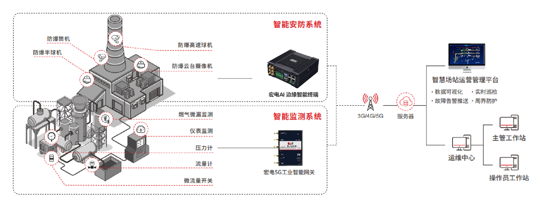宏電5G工業(yè)網(wǎng)關(guān)具備強(qiáng)大的邊緣計(jì)算能力,能夠?qū)崿F(xiàn)多品牌、多型號、多協(xié)議類型燃?xì)饬髁坑?jì)的數(shù)據(jù)采集與解析,實(shí)現(xiàn)對壓力、流量、可燃?xì)怏w等傳感器數(shù)據(jù)實(shí)時(shí)監(jiān)測。通過部署AI邊緣智能終端對油氣場站內(nèi)視頻數(shù)據(jù)進(jìn)行人臉、工服安全帽、吸煙打電話、火焰煙霧等Al分析識(shí)別,對場站的出入口、周界管理做到巡檢有計(jì)劃、過程有監(jiān)督、事后有分析、數(shù)據(jù)可視化。助力企業(yè)實(shí)現(xiàn)智慧化運(yùn)營,讓看不見的風(fēng)險(xiǎn)實(shí)時(shí)可見,切實(shí)守護(hù)城市安全生命線。