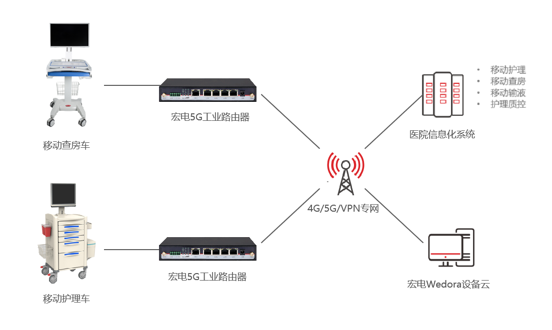 通過在移動(dòng)護(hù)理車、查房車上部署5G工業(yè)路由器,以5G/4G APN專網(wǎng)為數(shù)據(jù)交互載體,醫(yī)護(hù)人員可實(shí)時(shí)接入院內(nèi)診療系統(tǒng),與院內(nèi)患者的電子病歷信息系統(tǒng)實(shí)時(shí)交互,患者檔案或醫(yī)療高清影像可秒速加載,實(shí)現(xiàn)醫(yī)院內(nèi)外信息實(shí)時(shí)共享。
