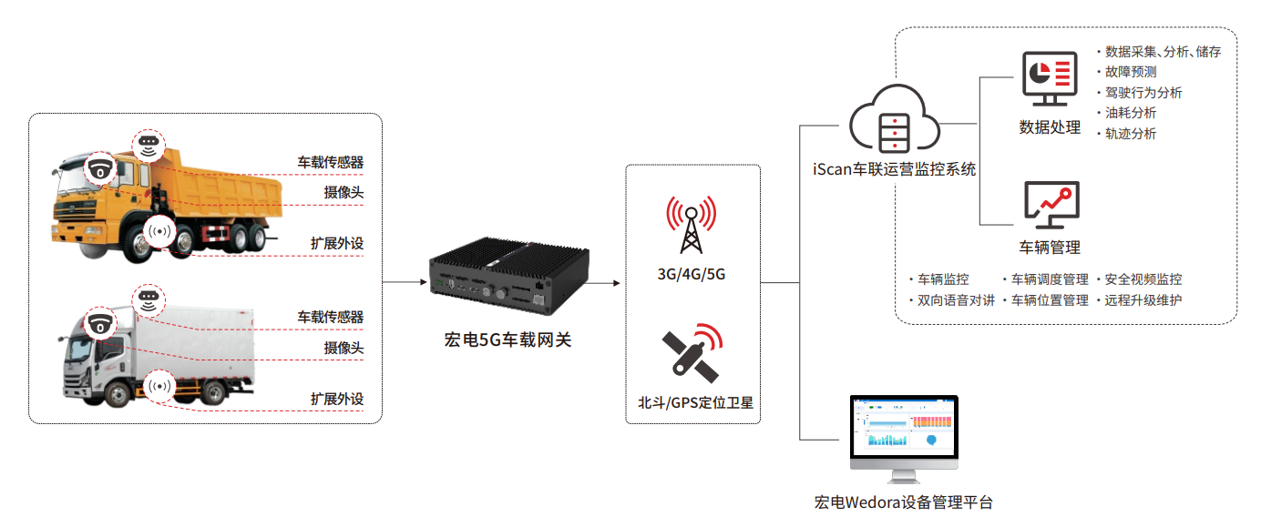 宏電車載網(wǎng)關(guān)為車輛提供高速安全的5G/4G網(wǎng)絡(luò),通過豐富的接口將車載攝像頭、調(diào)度終端、車載機(jī)頂盒等設(shè)備統(tǒng)一接入網(wǎng)絡(luò),實(shí)現(xiàn)對貨運(yùn)車輛的規(guī)范管理和統(tǒng)一調(diào)度,提高車輛運(yùn)營效率,對駕駛員的不安全駕駛行為做到實(shí)時(shí)監(jiān)管,并過語音對講的方式做到實(shí)時(shí)提醒,減少事故發(fā)生的概率。