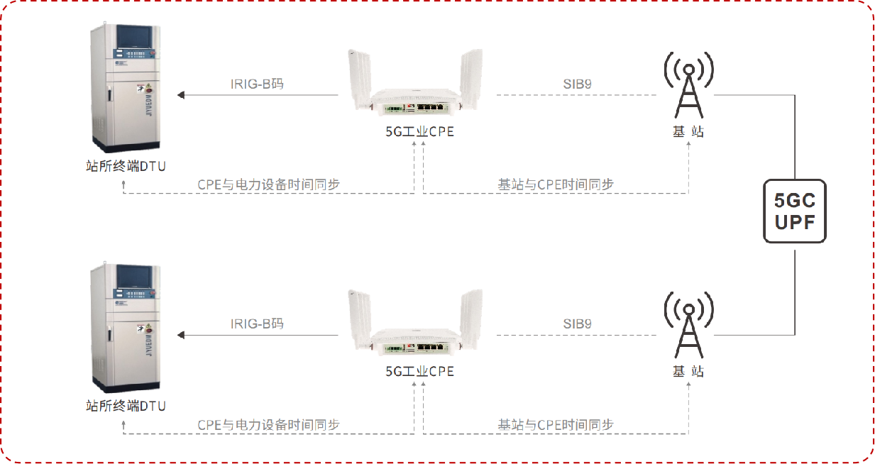 基于宏電5G工業(yè)智能網(wǎng)關(guān)/CPE的線路差動保護(hù)解決方案通過在兩端的站所終端DTU上部署5G工業(yè)智能網(wǎng)關(guān)/CPE,構(gòu)建5G高速網(wǎng)絡(luò)實現(xiàn)終端間的互聯(lián)互通;5G基站通過GPS/北斗衛(wèi)星獲取精準(zhǔn)定時,與標(biāo)準(zhǔn)時間進(jìn)行同步后,宏電5G工業(yè)智能網(wǎng)關(guān)/CPE通過空口SIB9消息獲取當(dāng)前精準(zhǔn)時鐘信息,再通過IRIG-B碼的方式脈沖到站所終端DTU,站所終端DTU在接收到數(shù)據(jù)后解析B碼信息,獲取標(biāo)準(zhǔn)時間,從而實現(xiàn)各裝置之間以及現(xiàn)場裝置與主站間的時鐘同步,實現(xiàn)點對點快速傳輸,完成故障自愈。