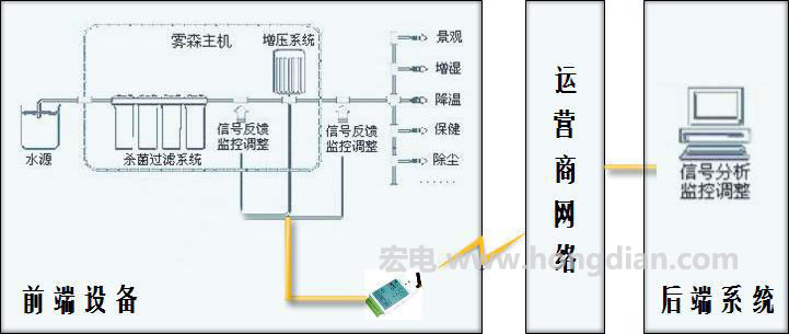宏電無線自動霧森系統(tǒng)是一種基于移動數(shù)據(jù)傳輸平臺的自動感應(yīng)、自動控制應(yīng)用,在固定或移動霧森主機(jī)內(nèi)置無線數(shù)據(jù)終端,以無線自動霧森系統(tǒng)為管理平臺,移動通信數(shù)據(jù)網(wǎng)絡(luò)為傳輸通道,實(shí)時或定時對前端霧森主機(jī)進(jìn)行控制,從而減少浪費(fèi),提高效率。