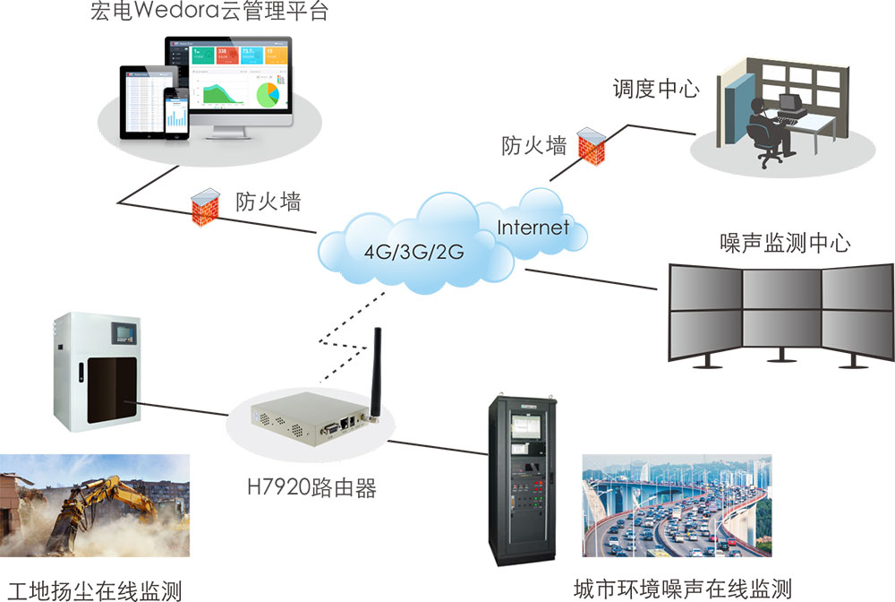 宏電噪聲遠(yuǎn)程監(jiān)控系統(tǒng)主要通過遠(yuǎn)方噪聲監(jiān)測儀、噪聲監(jiān)測數(shù)據(jù)采集設(shè)備,無線傳輸設(shè)備實時監(jiān)測區(qū)域噪聲,然后經(jīng)過分析、處理、打包通過宏電H7920工業(yè)無線路由器上傳數(shù)據(jù)到監(jiān)測中心存入到歷史數(shù)據(jù)庫和實時數(shù)據(jù)庫進行顯示和存儲以及處理。
