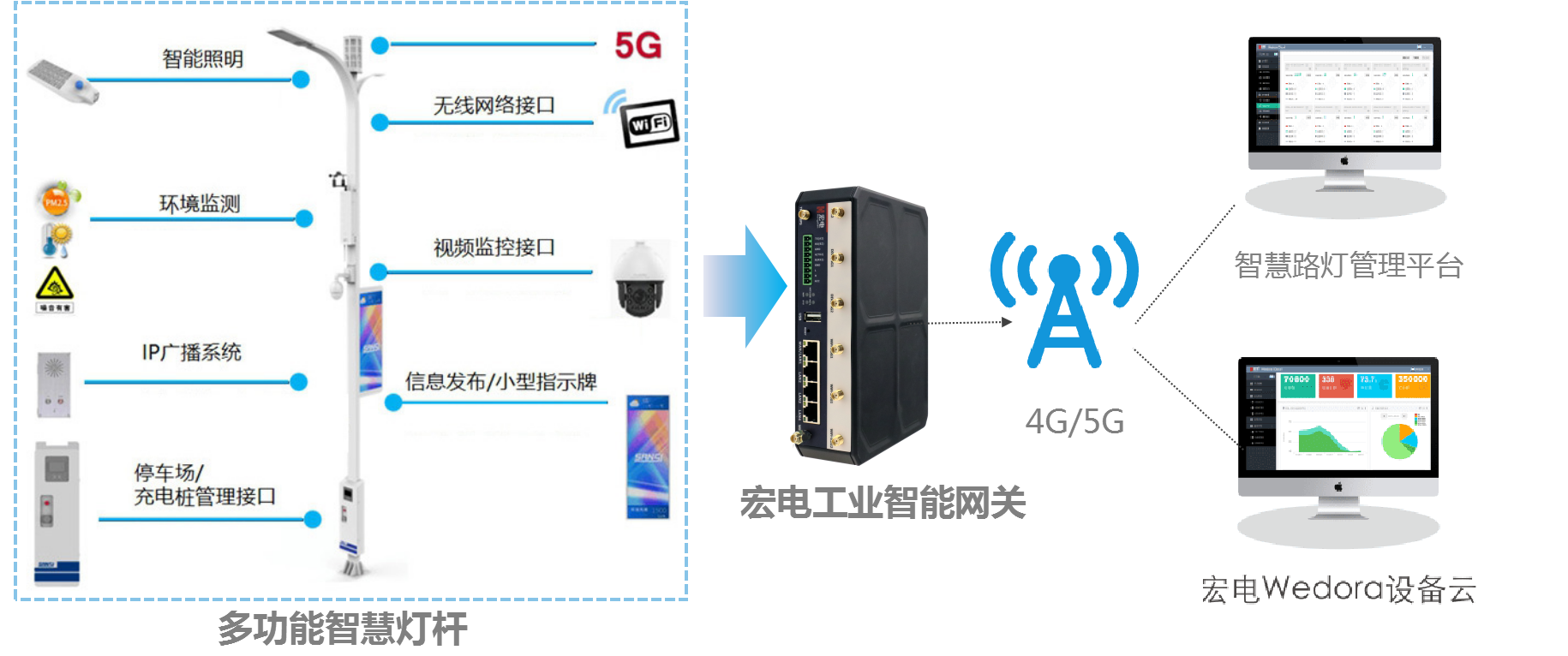 針對(duì)智慧燈桿集成系統(tǒng)連接了大量的物聯(lián)網(wǎng)傳感采集設(shè)備,需要一款強(qiáng)大的設(shè)備聯(lián)通以上系統(tǒng)并承載大量的數(shù)據(jù)傳輸,宏電提供具備邊緣計(jì)算能力的工業(yè)智能物聯(lián)網(wǎng)關(guān)+平臺(tái)方案,打通數(shù)據(jù)鏈路,基于4G無線網(wǎng)絡(luò)覆蓋,實(shí)現(xiàn)城市道路高清監(jiān)控視頻實(shí)時(shí)回傳,智能照明遠(yuǎn)程控制,環(huán)境監(jiān)測(cè)信息實(shí)時(shí)采集傳輸,多媒體信息實(shí)時(shí)發(fā)布、平臺(tái)遠(yuǎn)程運(yùn)維管理,滿足城市各要素全域數(shù)據(jù)管理,適用于“智慧燈桿”、“5G多功能桿”、“多功能信息桿”等應(yīng)用。