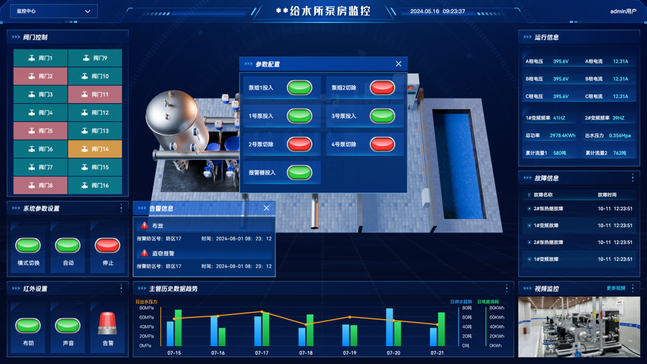 依據(jù)泵房布局1:1構(gòu)建3D炫酷孿生組態(tài),將泵房中泵組、水箱、閥門、儀表等綜合運(yùn)行數(shù)據(jù)直觀可視化。