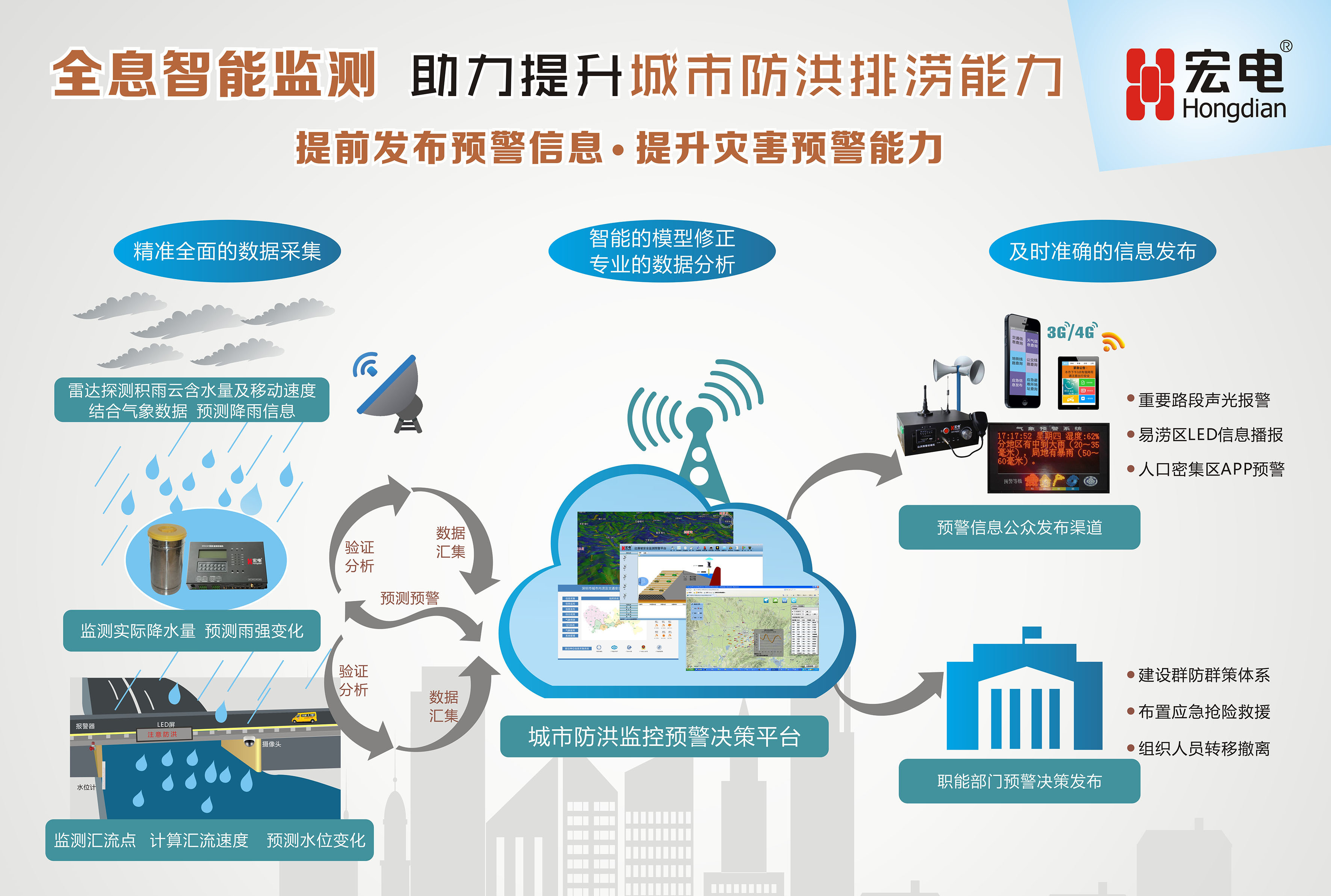 工程中心依托宏電十幾年在智慧水利領(lǐng)域的成熟經(jīng)驗(yàn),通過(guò)全息智能監(jiān)測(cè)預(yù)警系統(tǒng),提升城市防洪排澇能力,在確保城市排水防澇安全的前提下,統(tǒng)籌自然降水、地表水和地下水的系統(tǒng)性,協(xié)調(diào)給水、排水等水循環(huán)環(huán)節(jié),最大限度地實(shí)現(xiàn)雨水在城市區(qū)域的積存、滲透和凈化,促進(jìn)雨水資源的利用和生態(tài)環(huán)境保護(hù)。