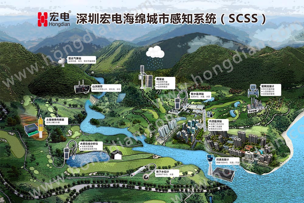 鑒于監(jiān)測數(shù)據(jù)和模擬仿真技術(shù)對(duì)于城市規(guī)劃、建設(shè)、運(yùn)行的重要性,深圳宏電基于新型的測量傳感設(shè)備,合理布設(shè)各類海綿體監(jiān)測站點(diǎn),依托城市水文模擬仿真軟件,通過物聯(lián)網(wǎng)、云計(jì)算和大數(shù)據(jù)平臺(tái),構(gòu)建宏電海綿城市感知系統(tǒng)(Sponge City Sensing System,縮寫為SCSS),完成對(duì)城市水循環(huán)過程的全方位立體監(jiān)控,解決“有多少水、水在哪里、往哪里去”的問題。