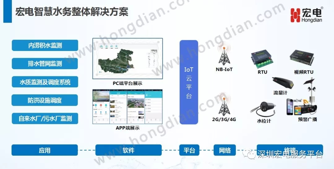宏電認為智慧水務是智慧城市的一部分,包括城市排水、污水處理、安全供水、雨水收集與防災等,涉及數(shù)據(jù)的采集、傳輸、分析及應用,是典型的物聯(lián)網(wǎng)應用場景。因此需要從物聯(lián)網(wǎng)架構整體的系統(tǒng)去解決,包括感知層、網(wǎng)絡層、平臺層進行整體設計。