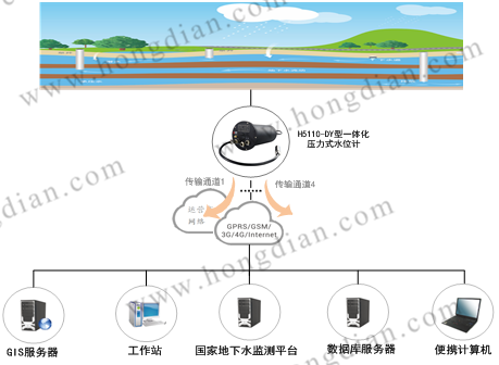 宏電地下水監(jiān)測管理系統(tǒng)主要由數(shù)據(jù)采集中心、數(shù)據(jù)傳輸中心和數(shù)據(jù)管理中心三大部分組成,采用宏電股份自主研發(fā)的H5110-DY一體化壓力式水位計(jì),實(shí)現(xiàn)以下功能和特點(diǎn):