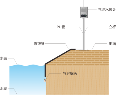 將一根上端裝有氣容的管子插入水中,以恒定流向管子里通入少量空氣,通過測量測管內(nèi)的空氣壓力,就可以換算出當(dāng)前的水位。氣泡式水位計只有一根氣管進(jìn)入水中,測試時再加壓,平時處在無壓或微壓狀態(tài),因此時飄很小,不需要定時率定。