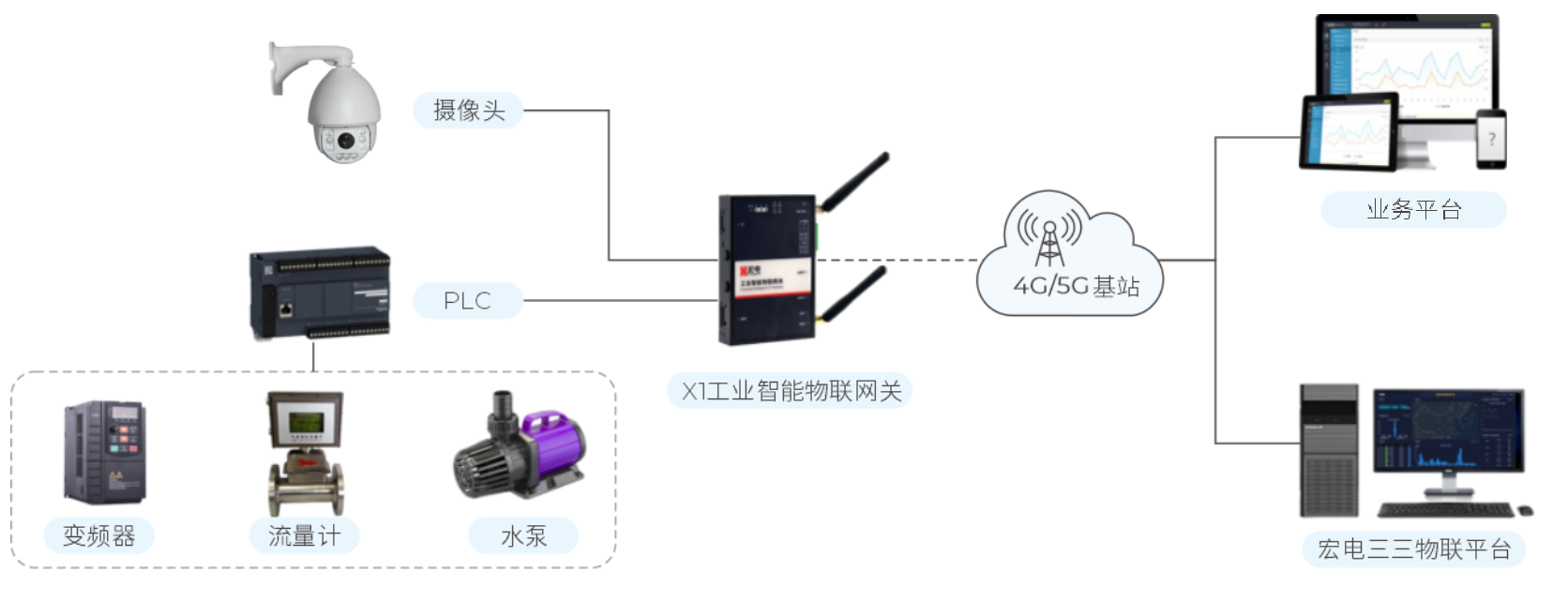 將宏電X1工業(yè)智能物聯(lián)網(wǎng)關(guān)與泵房現(xiàn)場PLC控制器、視頻監(jiān)控設(shè)備連接,多方位采集泵房設(shè)備的運(yùn)行狀態(tài),將視頻圖像,水池水位,出站流量、壓力,泵站供應(yīng)電流、電壓,泵的開關(guān)狀態(tài)、工作電流、電壓、頻率等數(shù)據(jù)通過4G/5G無線方式上報(bào)到業(yè)務(wù)平臺,泵房管理人員可以在業(yè)務(wù)平臺或者內(nèi)部局域網(wǎng)隨時(shí)遠(yuǎn)程監(jiān)測站內(nèi)狀態(tài),確保供水系統(tǒng)的安全穩(wěn)定運(yùn)行。