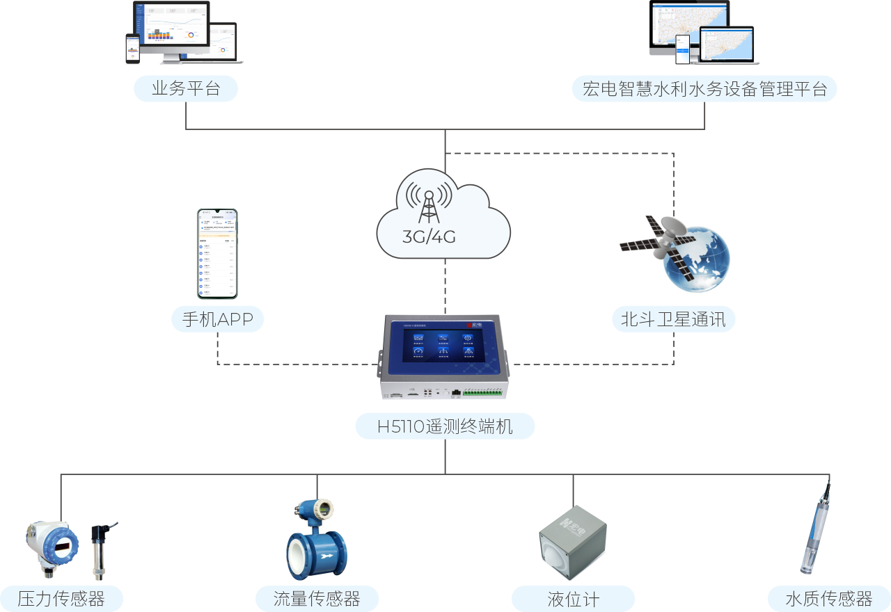 在城鄉(xiāng)供水通信網(wǎng)絡(luò)系統(tǒng)中采用宏電H5110遙測終端機(jī),為水源、水廠、蓄水池、閥門、管網(wǎng)等監(jiān)測設(shè)施站點(diǎn)與各供水管理站之間提供傳感器數(shù)據(jù)采集、泵閥遠(yuǎn)程控制、數(shù)據(jù)上傳平臺和遠(yuǎn)程運(yùn)維等功能。H5110遙測終端機(jī)可以向平臺提供數(shù)據(jù),也可以感知和控制傳感器設(shè)備;由平臺下發(fā)指令控制閥門的開合,同時(shí)感知壓力計(jì)、流量計(jì)的數(shù)據(jù)情況,適配宏電智慧水利水務(wù)設(shè)備管理平臺,可便捷地配置供水設(shè)備,實(shí)現(xiàn)供水場景一體化的監(jiān)測管理。
