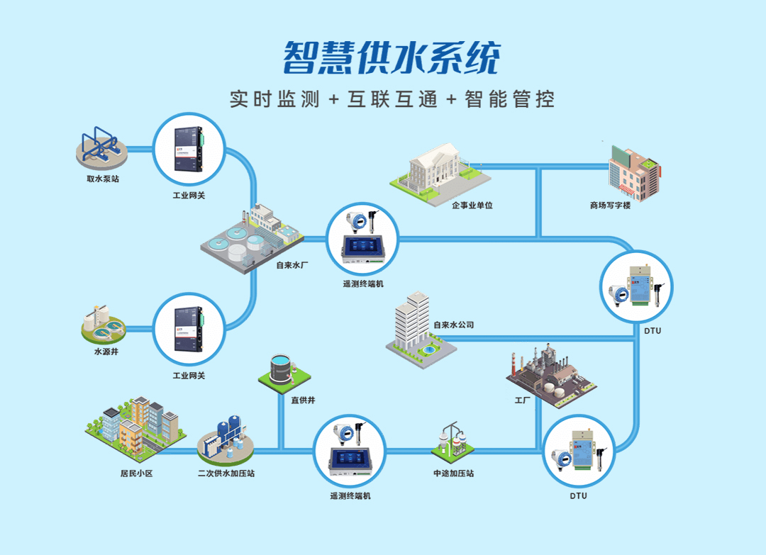 系統(tǒng)涵蓋城市供水中的水源地取水、水廠制水、管網(wǎng)輸水、加壓送水、用戶用水等各個環(huán)節(jié),實現(xiàn)全流程遠程監(jiān)管和智能聯(lián)動控制,優(yōu)化生產(chǎn)調(diào)度,保障高效供水,促進節(jié)能降耗,降低產(chǎn)銷差,是水司實現(xiàn)智慧化運營的重要途徑。