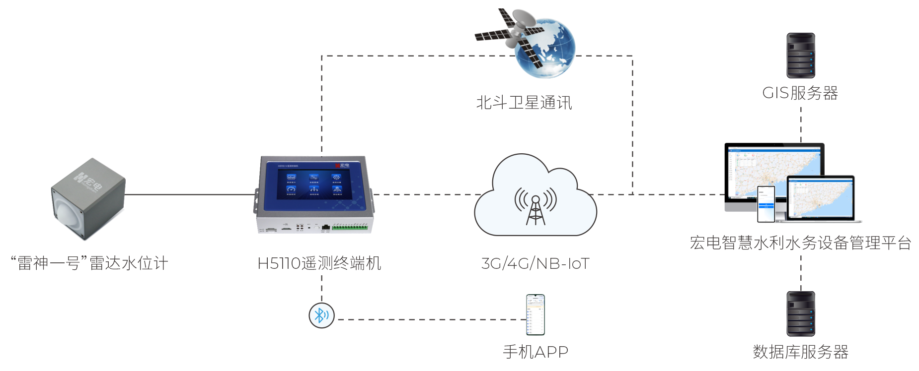 本項(xiàng)目對鳳陽縣內(nèi)的河道進(jìn)行水位計(jì)量設(shè)施建設(shè),采用宏電“雷神一號”雷達(dá)水位計(jì)進(jìn)行數(shù)據(jù)采集,通過宏電H5110遙測終端機(jī)進(jìn)行數(shù)據(jù)傳輸,并使用宏電智慧水利水務(wù)設(shè)備管理平臺進(jìn)行數(shù)據(jù)顯示和分析,實(shí)現(xiàn)河道水位的在線監(jiān)測。
