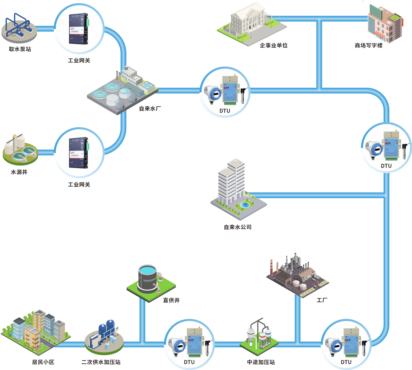 系統(tǒng)涵蓋城市供水中的水源地取水、水廠制水、管網(wǎng)輸水、加壓送水、用戶用水等各個(gè)環(huán)節(jié),實(shí)現(xiàn)全流程遠(yuǎn)程監(jiān)管和智能聯(lián)動(dòng)控制,優(yōu)化生產(chǎn)調(diào)度,保障高效供水,促進(jìn)節(jié)能降耗,降低產(chǎn)銷差,是水司實(shí)現(xiàn)智慧化運(yùn)營(yíng)的重要途徑。