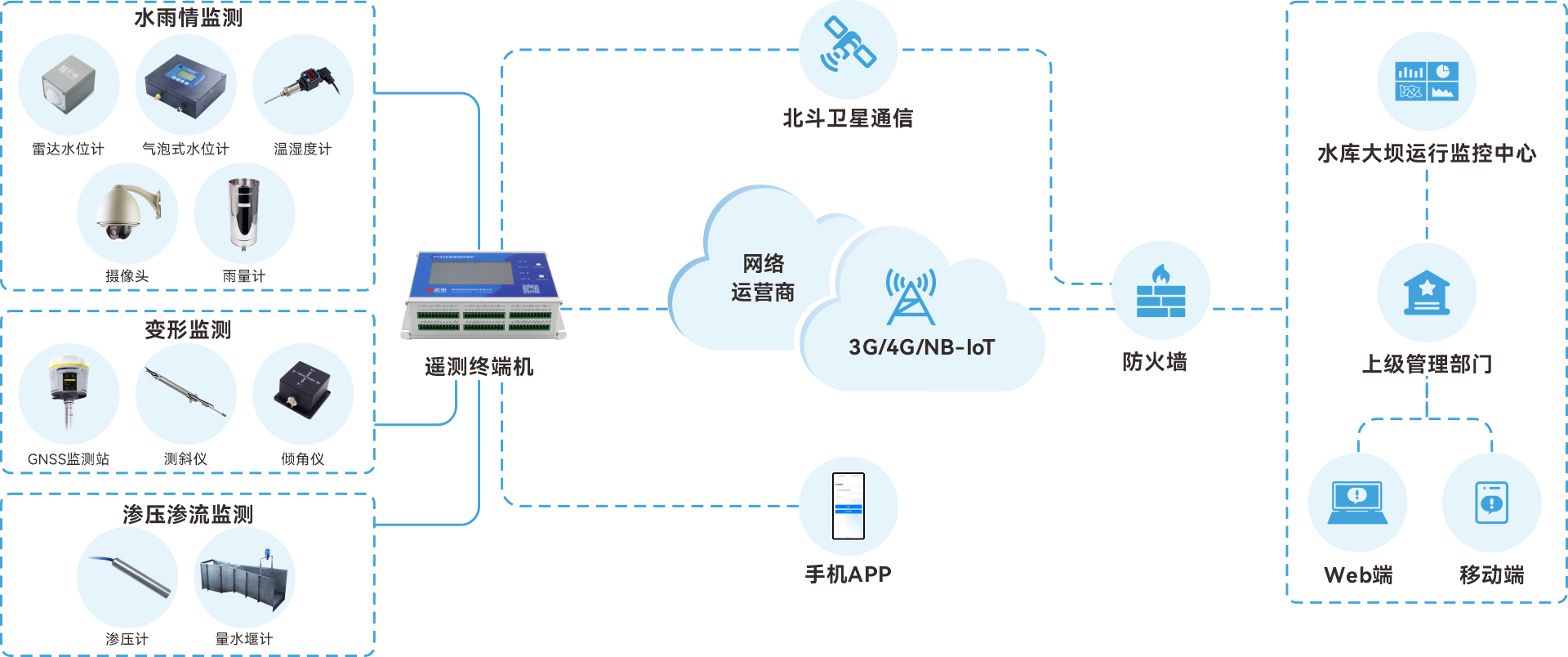 系統(tǒng)包含水庫雨水情監(jiān)測(cè)系統(tǒng)和大壩安全監(jiān)測(cè)自動(dòng)化系統(tǒng)。水庫雨水情監(jiān)測(cè)系統(tǒng)以遙測(cè)終端為核心,配置翻斗式雨量計(jì)、雷達(dá)式或氣泡式水位計(jì)、攝像頭、電源系統(tǒng)、避雷系統(tǒng)以及相關(guān)的土建及附屬設(shè)施,實(shí)現(xiàn)雨水情信息的自動(dòng)采集和自動(dòng)傳輸。大壩安全監(jiān)測(cè)自動(dòng)化系統(tǒng)可實(shí)現(xiàn)大壩表面變形監(jiān)測(cè)和滲流監(jiān)測(cè)。整個(gè)系統(tǒng)實(shí)現(xiàn)水庫大壩的全面感知監(jiān)測(cè)、綜合風(fēng)險(xiǎn)評(píng)估、科學(xué)輔助決策、智能分析預(yù)警、常態(tài)巡檢及預(yù)案管理等主要功能,助力水庫智慧化監(jiān)管。