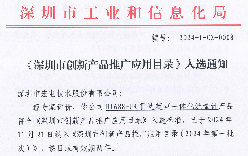 近日,深圳市工業(yè)和信息化局公布《深圳市創(chuàng)新產(chǎn)品推廣應(yīng)用目錄(2024年第一批次)》,宏電股份申報(bào)的H1688-UR雷達(dá)超聲一體化流量計(jì)憑借突出的科技創(chuàng)新能力和領(lǐng)先的技術(shù)指標(biāo)等綜合優(yōu)勢(shì)成功入選,并成為政府機(jī)構(gòu)采購?fù)扑]產(chǎn)品。