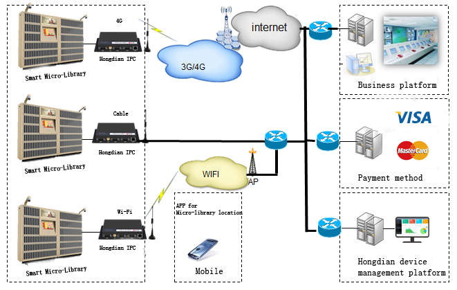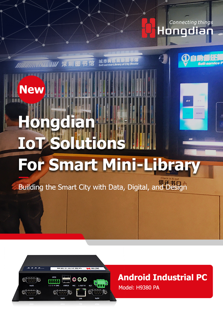 The Project of Smart Mini-library consists of four parts: unmanned bookcase, Hongdian intelligent industrial PC, cloud platform and APP. The Hongdian H9380A Intelligent Industrial Computer is connected to the peripherals such as man-machine interactive display screen, RFID card reader, touch screen, bookcase electronic lock, camera, payment o-dimensional wharf and so on. The information of book borrowing, payment and equipment running status is uploaded to the operation platform of intelligent Mini-library, APP and Hongdian Wedora cloud platform in real time. Operating enterprises can carry out business analysis and operation remotely, manage bookcases, reserve books, and set up terminals. The unmanned bookcase can be placed indoors or outdoors and no longer be confined to fixed indoor places such as schools and libraries.