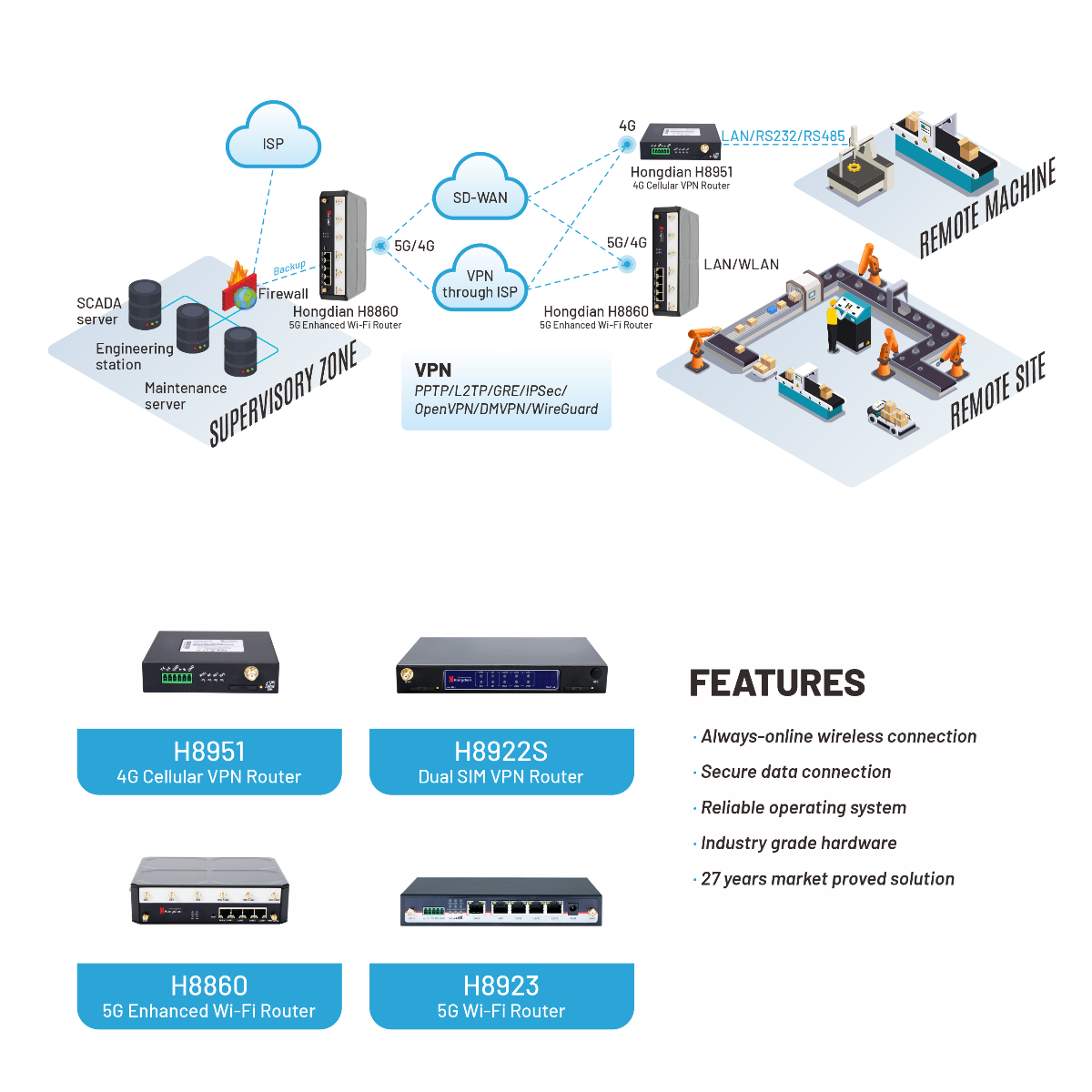 SD-WAN, as a new network architecture, is gradually becoming one of the important technologies for realizing the Industrial Internet. Hongdian connectivity management solution for IIoT Relying on SD-WAN, it is easy to manage all sites&machines network.Simple setup to connect multiple machines or sites into a same network via public network without public IP.Engineer can remotely access to every single machine from anywhere.All tunnel are encrypted with advanced cryptography protocol to protect the data.Each network is independent and can be deployed on either internet or intranet.Reduce the difficulty of management for widely-deployed IoT machines such as PLC, RTU, HMI, computer desktop, pump, etc.