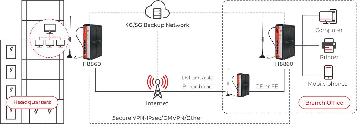 H8860, released by Hongdian for FWA, can be connected to 5G NSA and SA networks. In the actual network environment, the download speed of H8860 can reach 800Mbps. Built-in Qualcomm chip provide powerful computing and ensure to remote office replacement smoothly. It supports 2.4G and 5.8G Wi-Fi at the same time, up to 64 client access, and various types of VPNs like L2tp, PPTP, IPSec, DMVPN, which can guarantee data security at all times.