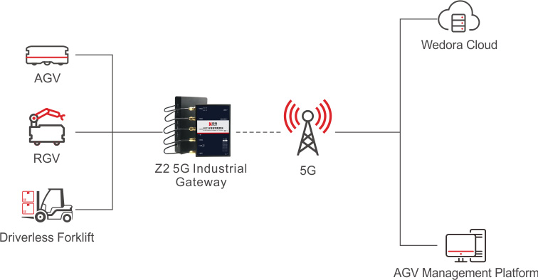 Hongdian 5G industrial gateway Z2 can be used to connect with PLC and controller of AGV, RGV and forklift, and to provide high-reliability and low-delay 5G private network which can replace the WLAN networking for unmanned control. Alarm and location information can be reported to cloud platform through 5G network, and the maintenance personnel can debug and fix the issue remotely and efficiently. The compact size of Hongdian Z2 simplified the installation process, and ensure the signal reception with its external 5G antennas in the mean time. Large AGV software program can ensure the network compatibility. Z2 can be assigned with fixed IP address. By adjusting AGV program and Z2 gateway port mapping function, data can be forwarded to the AGV directly and realizing the connection between large AGV and the platform.