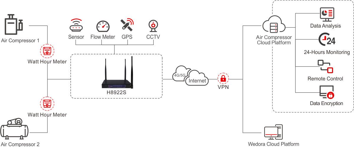 In view of the three major problems of high energy consumption, expensive maintenance and large stock in the air compressor market, Hongdian launched an energy-saving solution for on-line monitoring of air compressors. Sensors, control boards, electronic valves and electricity meter of the air compressor system. Hongdian H8922S Router provides RS-232/485/488 serial port, LAN network port and other equipment to access the above devices, which are transmitted and collected to the air compressor online monitoring cloud platform through the 4G/5G network. The cloud platform can remotely monitor and control the operation of air compressor equipment, provide better equipment configuration, and reduce the energy consumption cost and labor cost of air compressor work. Based on the experience of the industry, Hongdian provides better solutions to enable the whole system to land faster and enable manufacturers to improve economic benefits.