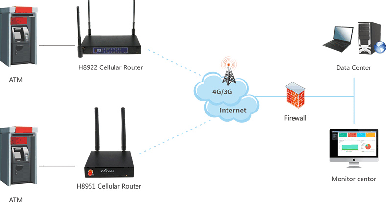 With the huge demand of wireless ATMs in the market and many years of experience in the M2M field, Hongdian has launched the Wireless ATM Networking Solution. It entirely changes the whole face of traditional wired ATM’s situation. It can support both wireless and landline networking. The user can use mobile network access to expand business in advance and no need to wait for the phone company to activate the landline which is more secure than before. The traditional wired ATM uses the VPN while our solution carry the VPDN network and VPN, and the solution is traceable and manageable for the devices which enables the user to manage mass devices remotely.