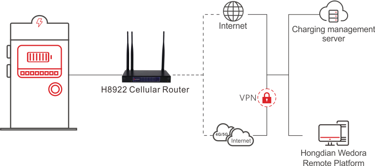 Hongdian H8922S router provides a reliable connection between charging station and control center by 4G/5G network. It helps the user monitor each charging pile status and provide user authentication, user data transmission, and payment service via management platform or control center. Connecting to the Hongdian Wedora Cloud Platform, the user can manage router online. Optional GPS pointing data can provide location information in customer App which helps customer find the charging location easily. Connecting with Hongdian H8922S RS232, RS485, LAN interface makes charging post more smarter, and administrator can use cloud platform to manage the group of charging post.