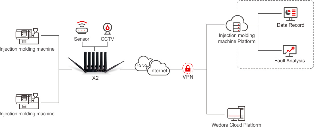Through the Hongdian X2 IOT Industrial Gateway, with RS-232 / 485 serial port, LAN network port, etc., can be connected to the injection molding machine sensor, control board to obtain data, compatible with hundreds of industrial communication protocols, through 4G / 5G / WIFI and other networks real-time. The sensor of the injection molding machine is collected into the equipment status, operating parameters and other data to the injection molding machine cloud. The platform can display the current equipment operation status in real time, record the time when the equipment failure occurs, and then automatically comprehensively analyze the equipment operation, output, shutdown, and various fault data, so as to facilitate the understanding of the field equipment situation, improve the equipment utilization rate, and then improve the efficiency, reduce operating costs.