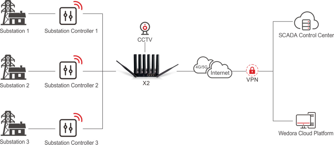 Detect the voltage and current sensors of the entrance and outlet circuits of the main transformer, the operation status of all equipment, circuit breakers and isolation switches in the control room, fire, flooding alarm, control room camera monitoring, the collected data are transmitted back to the general command center by Hongdian X2 IoT Industrial Gateway, and at the same time monitor whether the data of multiple transformer stations are normal, there is no need to send manual on-site duty. When the power transformation problem occurs, the problem of the transformer station can be remotely checked and solved. There is also an early warning report for fires and flooding, and can be dealt with in time when the shoots appear.