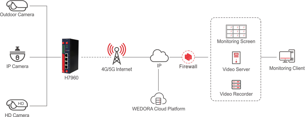 Hongdian launched a 4G/5G router with POE power supply function, which can provide network and power for four channels of video surveillance equipment at the same time. Wireless video surveillance equipment is not bound by cable distance and can be quickly installed and removed in any scene.It can also build a special video monitoring network to transmit video data.Traditional wired video surveillance system can also use H7960, using 4G/5G network to add backup lines, so that video surveillance is always online.