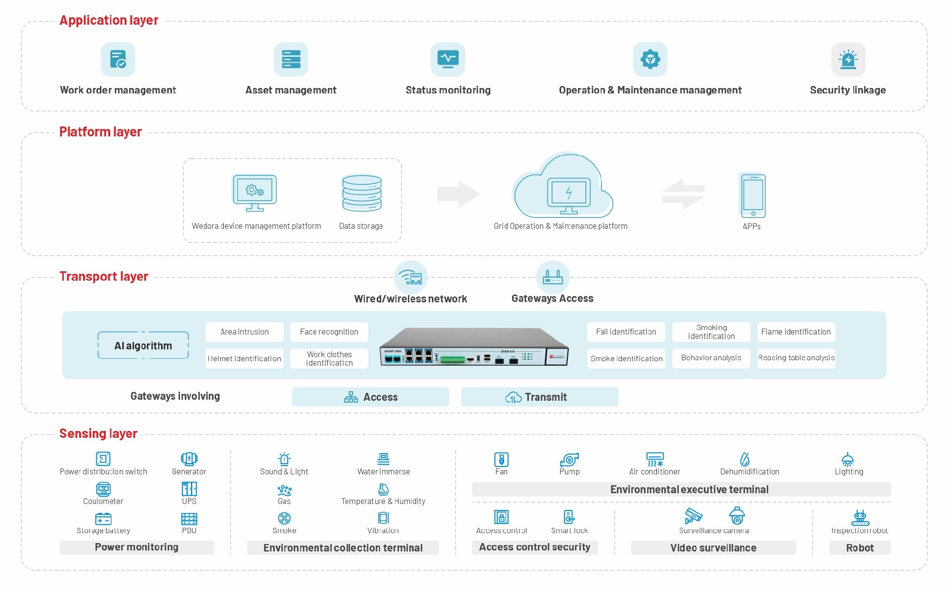 As an important hub of terminal electric energy supply and distribution, the running stability of distribution room is directly related to the reliability of power supply and the safety of life and property. At present, the equipment inspection, facility maintenance and operation safety control of the distribution room are mainly managed by manual management. However, the efficiency of manual inspection is not high, and modern intelligent monitoring and inspection schemes are urgently needed.