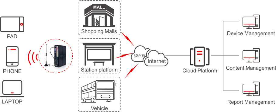 Hongdian 5G Wi-Fi routers can be used as Wi-Fi hotspots and installed in public transportation vehicles, such as city buses, long-distance buses, tour buses, subways and trains, as well as public places with wide Wi-Fi coverage such as cafes, restaurants, stations, and terminals. System operators can issue Portal authentication through the Hongdian management platform to provide offline Internet services for users, which greatly improves the satisfaction and loyalty of users. At the same time, the system operator can accurately push advertisements to different user groups according to the analysis of user characteristics and online time period. The project creates new mobile Internet channels and business models for bus companies, advertising agencies, mobile operators, advertisers, and surrounding businesses through public Wi-Fi hotspots.