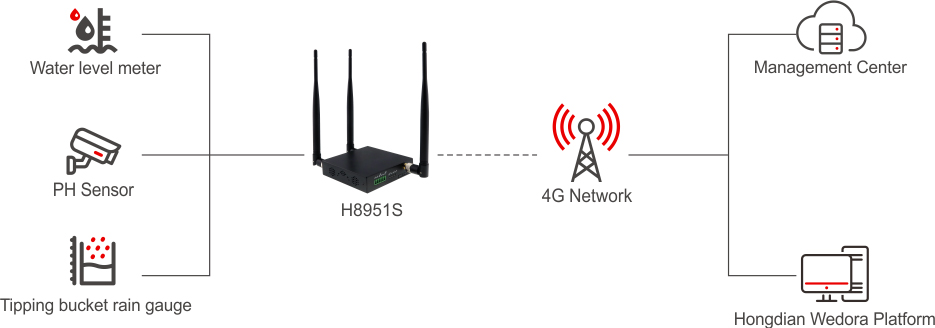 Above these requirements, Hongdian has published industrial leading waste water manage smart network, we called it Sponge City Sensing System(SCSS), in view of the importance of monitoring data and simulation technology for urban planning, construction and operation, plenty of sensors are deployed on the monitoring sites, with 3G/4G, Hongdian router transfers these sensors data to Hongdian IoT management platform which provides data support for monitoring and evaluating system, monitoring and evaluating system is based on swmm and generates different alarm reports about water quality real-time, administrator can find and notify the relative responsible person to stop waste water in time.