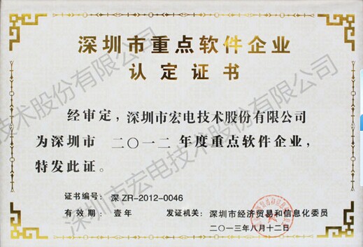 經(jīng)我市專家評(píng)審及市科技主管部門、稅務(wù)部門聯(lián)席會(huì)議審定,2012年度深圳市重點(diǎn)軟件企業(yè)名單出爐,深圳宏電成為被認(rèn)定的深圳新一代信息技術(shù)領(lǐng)域的市重點(diǎn)軟件企業(yè)。