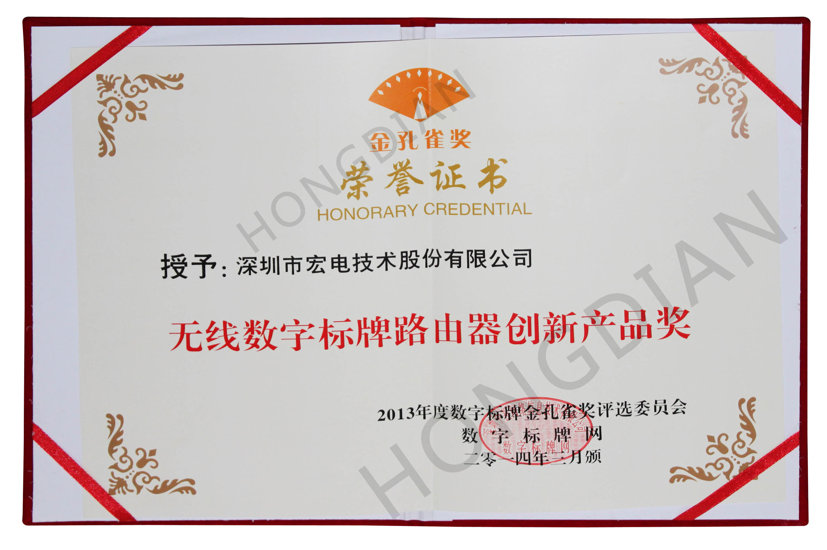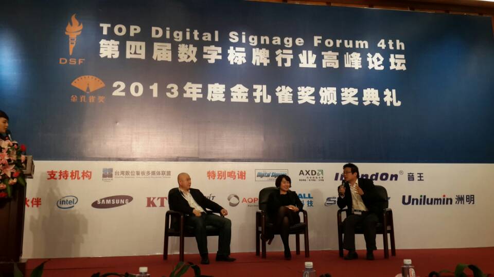 2014年3月13日,數(shù)字標牌行業(yè)年度盛宴——第四屆數(shù)字標牌行業(yè)高峰論壇暨2013年度金孔雀獎頒獎盛典在深圳圣廷苑酒店隆重舉行,吸引了數(shù)字標牌、廣告機、自助終端行業(yè)內(nèi)資深專家、企業(yè)高管和業(yè)內(nèi)人士200多人參會。作為國內(nèi)M2M無線傳輸領航企業(yè)和領航的智能無線數(shù)字標牌方案提供商,深圳市宏電技術(shù)股份有限公司受邀參加了此次盛會。在2013年度金孔雀獎頒獎盛典上,宏電作為一家無線通信解決方案提供商榮獲“2013年度無線數(shù)字標牌路由器創(chuàng)新產(chǎn)品獎”這一殊榮。在數(shù)字標牌高峰論壇上,宏電公司高層施總作為特邀嘉賓就 “移動時代下數(shù)字標牌發(fā)展趨勢”主題與業(yè)界精英展開高端對話。