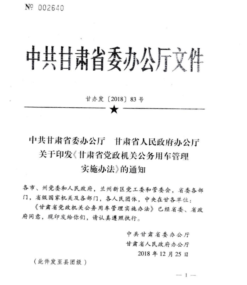 為了規(guī)范全省黨政機(jī)關(guān)公務(wù)用車管理,甘肅省于2018年12月發(fā)布《甘肅省黨政機(jī)關(guān)公務(wù)用車管理實(shí)施辦法》,要求各類公務(wù)車納入平臺(tái)集中管理,安裝定位設(shè)備,采用信息化手段統(tǒng)籌調(diào)度、高效使用。