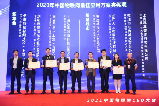 4月20日,2021中國物聯(lián)網(wǎng)CEO大會(huì)暨“物聯(lián)之星”頒獎(jiǎng)盛典”在上海舉辦。大會(huì)對(duì)“2020年度物聯(lián)之星評(píng)選”獲獎(jiǎng)企業(yè)進(jìn)行了現(xiàn)場(chǎng)頒獎(jiǎng),宏電憑借24年物聯(lián)網(wǎng)無線通信經(jīng)驗(yàn),強(qiáng)大的終端硬件+云平臺(tái)一站式物聯(lián)網(wǎng)服務(wù)能力,從400家評(píng)選企業(yè)中脫穎而出,連獲兩大獎(jiǎng)項(xiàng):2020年中國物聯(lián)網(wǎng)最具影響力云平臺(tái)企業(yè)獎(jiǎng)和2020年中國物聯(lián)網(wǎng)最佳應(yīng)用方案——新零售方案應(yīng)用獎(jiǎng)。