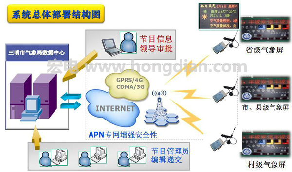 LED無(wú)線氣象信息發(fā)布系統(tǒng),所有的數(shù)據(jù)來(lái)源可與氣象局的數(shù)據(jù)庫(kù)對(duì)接,系統(tǒng)實(shí)時(shí)采集并傳輸?shù)狡翆?shí)時(shí)顯示,當(dāng)前時(shí)間,氣象預(yù)警信號(hào)圖標(biāo)、實(shí)時(shí)雨量、熱帶氣旋等信息;實(shí)時(shí)的滾動(dòng)文字信息,發(fā)布最新的氣象、重要的信息、通知、歡迎詞等圖文信息。
