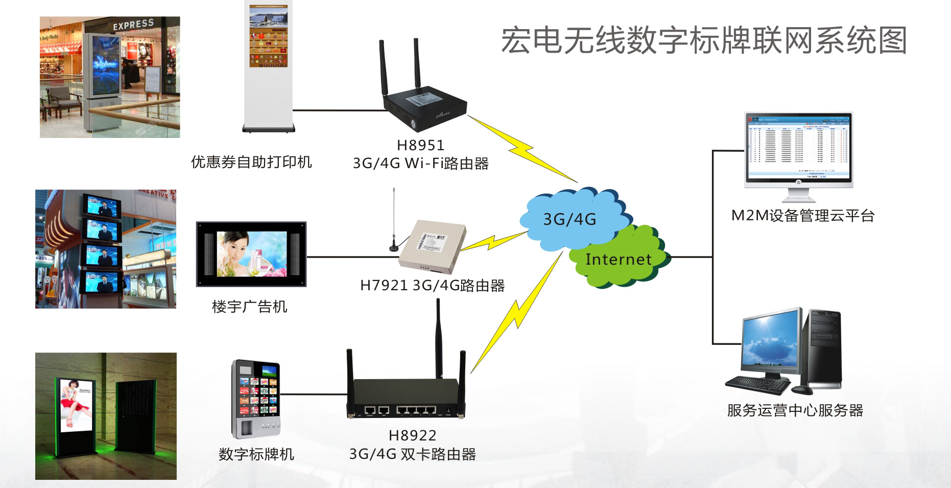宏電無線數(shù)字標(biāo)牌系統(tǒng)主要由數(shù)字標(biāo)牌終端、3G/4G 工業(yè)級無線路由器和運(yùn)營管理服務(wù)中心平臺三部分組成。其中,數(shù)字標(biāo)牌終端包括控制器、播放終端和顯示終端組成,是消費(fèi)用戶直接可操作業(yè)務(wù)的機(jī)器終端。此次項(xiàng)目中采用了宏電針對數(shù)字標(biāo)牌與自助終端設(shè)備無線聯(lián)網(wǎng)應(yīng)用推出的高性能3G/4G工業(yè)級無線路由器系列產(chǎn)品,該系列產(chǎn)品延續(xù)了宏電工業(yè)級產(chǎn)品質(zhì)量,采用電科院EMC三級電磁兼容設(shè)計(jì)和5~36V寬電壓設(shè)計(jì),使得設(shè)備在戶外、高溫度、高濕度、高干擾等復(fù)雜的應(yīng)用環(huán)境下都能夠正常、穩(wěn)定運(yùn)行;獨(dú)具的PIN碼保護(hù)、密碼加密、參數(shù)隱藏、移動復(fù)位等特色功能能夠有效保障客戶的使用與數(shù)據(jù)安全。同時(shí),設(shè)備使用LCP、ICMP、流量等多種鏈路檢測方法,確保了設(shè)備7x24小時(shí)永遠(yuǎn)在線。
