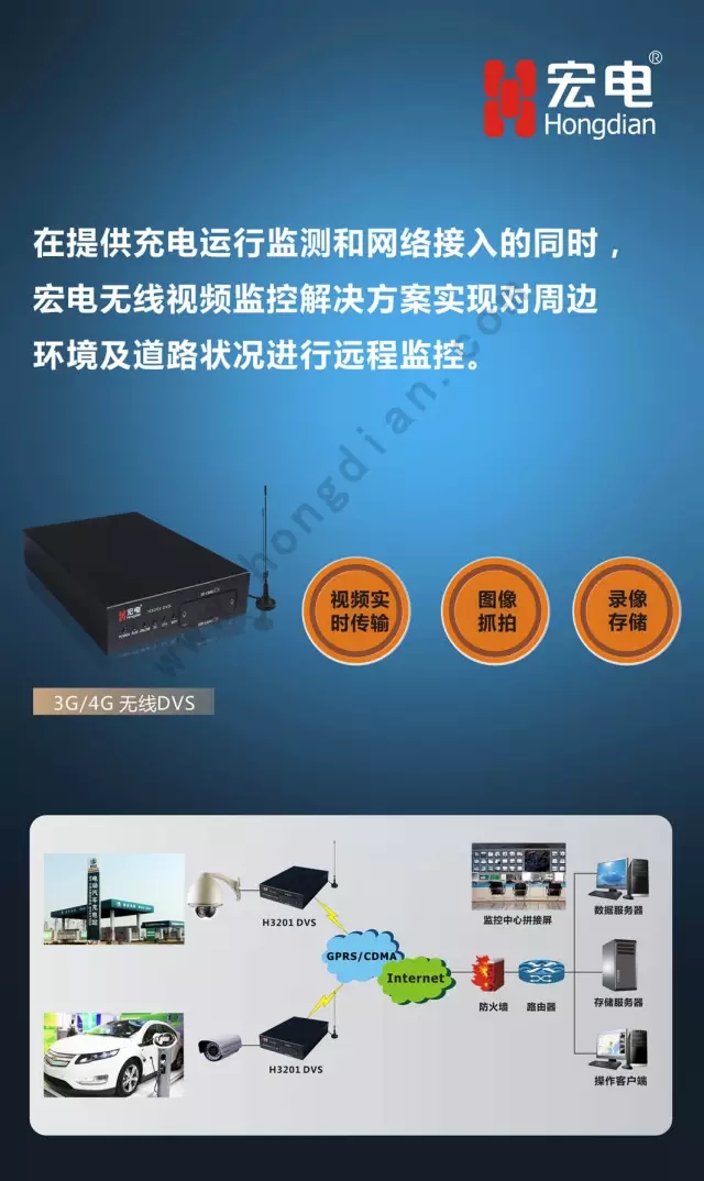 對(duì)于對(duì)安全監(jiān)控要求比較嚴(yán)的充電樁企業(yè),可以在項(xiàng)目中集成宏電無(wú)線視頻監(jiān)控設(shè)備,在提供充電運(yùn)行監(jiān)測(cè)和網(wǎng)絡(luò)接入的同時(shí),可以實(shí)現(xiàn)對(duì)周邊環(huán)境及道路狀況的實(shí)時(shí)遠(yuǎn)程監(jiān)控。