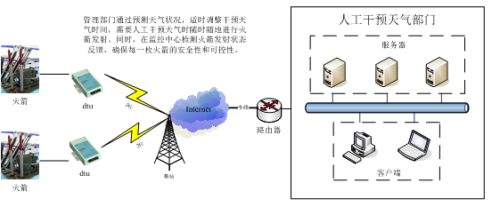 人工影響天氣火箭發(fā)射裝置有固定點(diǎn)火箭發(fā)射架和車(chē)載火箭發(fā)射架兩種,固定點(diǎn)火箭發(fā)射架主要安裝在遠(yuǎn)離城市的地方,車(chē)載火箭發(fā)射架則需要根據(jù)實(shí)際情況、旱情和冰雹預(yù)測(cè)進(jìn)行隨時(shí)機(jī)動(dòng)?;鸺l(fā)射架上安裝的宏電DTU將火箭發(fā)射架的參數(shù)全部收集和回傳給數(shù)據(jù)中心,中心監(jiān)控人員通過(guò)對(duì)云層的觀察確定火箭的發(fā)射時(shí)間和發(fā)射方向,從而確?;鸺龔楊^可以準(zhǔn)確的到達(dá)預(yù)定云層,實(shí)現(xiàn)人工增雨的效果。宏電DTU的穩(wěn)定工作,保障了火箭發(fā)射的順利進(jìn)行,實(shí)現(xiàn)了人工增雨防雹工作,已成為國(guó)內(nèi)人工影響天氣的重要組成環(huán)節(jié)。