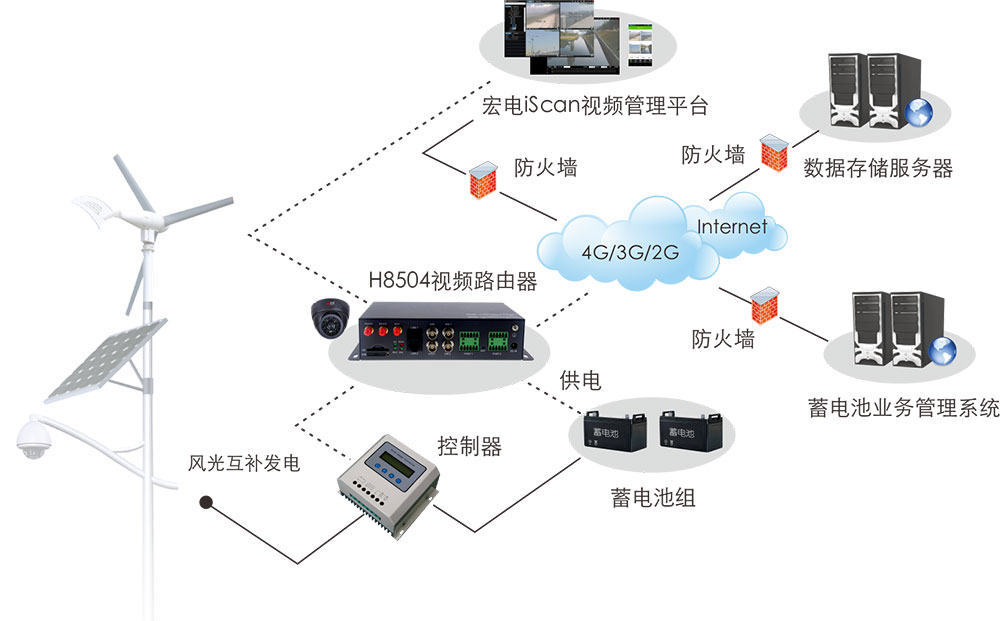 風(fēng)光互補(bǔ)監(jiān)控系統(tǒng)由風(fēng)力發(fā)電機(jī)、太陽能電池板、攝像頭、宏電視頻路由器VTU H8504、控制器、蓄電池組、宏電視頻云管理平臺(tái)組成,通過宏電視頻路由器將森林場(chǎng)景監(jiān)控畫面通過4G高速網(wǎng)絡(luò)實(shí)時(shí)傳輸?shù)椒阑鸨O(jiān)控中心以及宏電視頻云管理平臺(tái),實(shí)現(xiàn)防火人員在室內(nèi)對(duì)野外的遠(yuǎn)距離集中監(jiān)控。