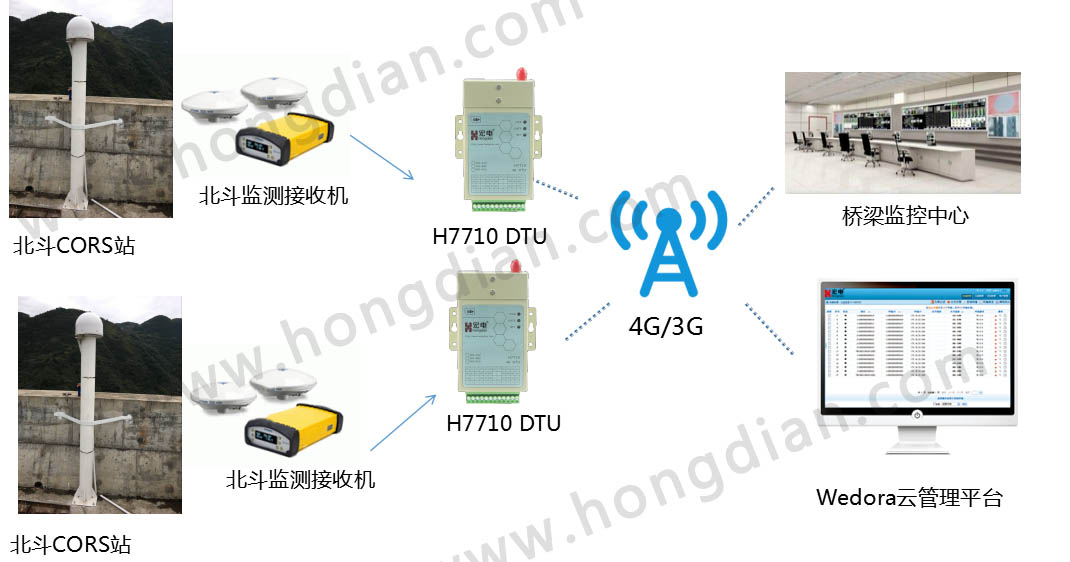 北斗橋梁形變監(jiān)測系統(tǒng)主要由北斗橋梁形變監(jiān)測站、北斗衛(wèi)星GPS接收機、宏電4G DTU、wedora云平臺組成,通過采集到的橋梁沉降、傾斜度、振動大小、撓度、位置等數(shù)據(jù)實時傳到橋梁監(jiān)控中心,實現(xiàn)對橋梁變形、受力、環(huán)境等全自動化在線監(jiān)測,實時掌握橋梁運行狀態(tài)。