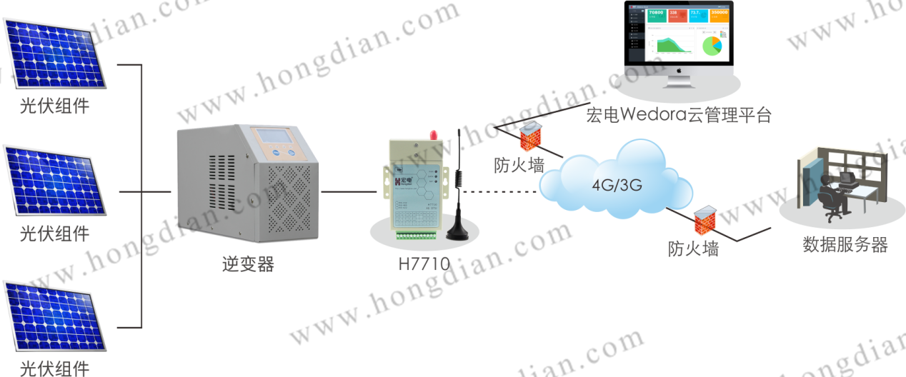 宏電光伏電站智能運維系統(tǒng)主要由光伏組件、匯流箱、逆變器、宏電4G DTU、宏電Wedora云平臺等組成。將逆變器采集到的光伏組件電流電壓數(shù)據(jù)通過4G DTU實時傳輸?shù)诫娏?shù)據(jù)服務(wù)器,實現(xiàn)發(fā)電量上傳、故障工單管理和設(shè)備數(shù)據(jù)實時展示等基本管控。通過宏電Wedora云平臺實現(xiàn)DTU設(shè)備的遠程管理,及時發(fā)現(xiàn)設(shè)備故障并告警,依據(jù)損失影響大小,安排巡檢與恢復(fù),提高設(shè)備利用率,減少因故障帶來的損失。